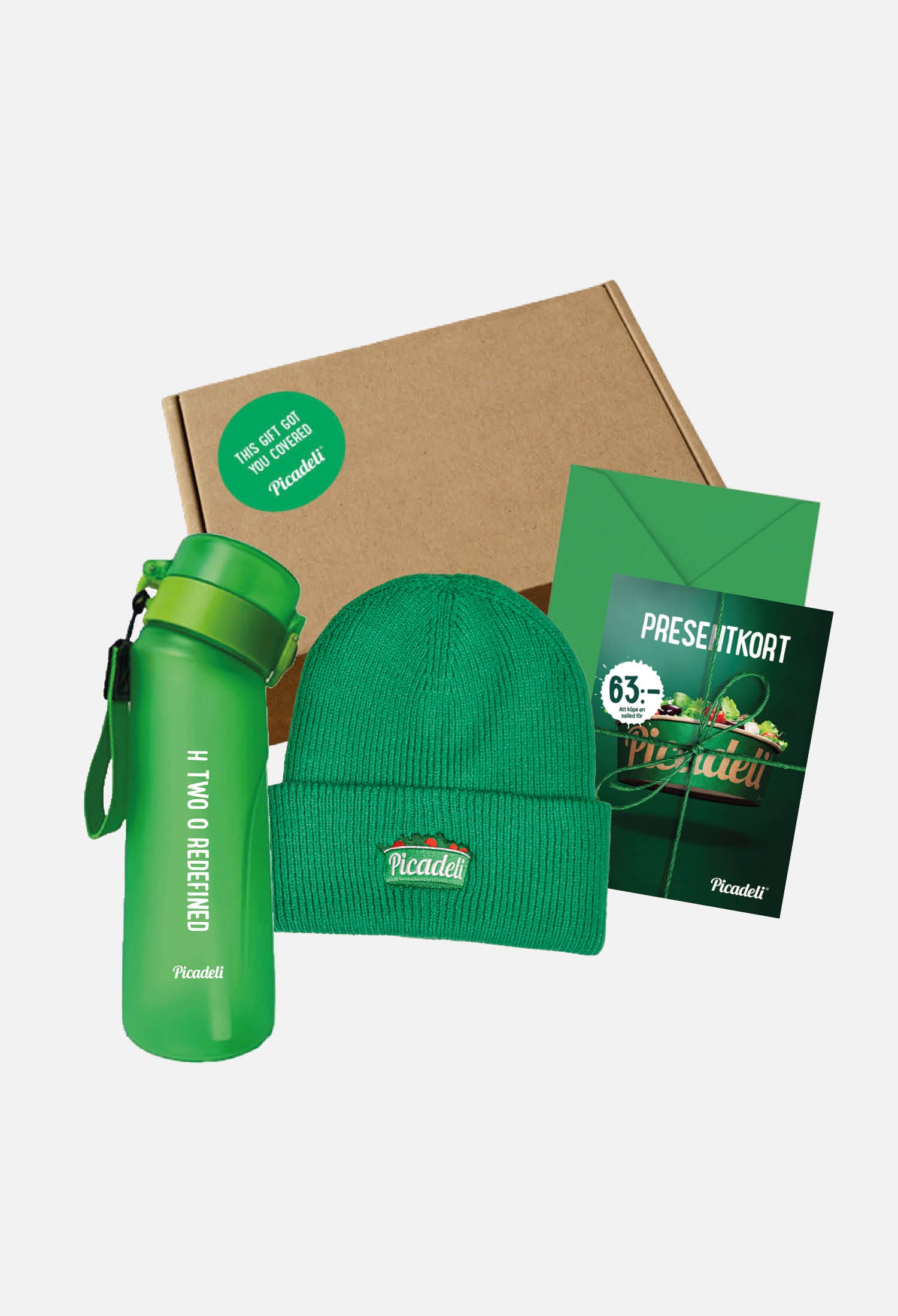 Ett on-of-a-kind-paket med Picadeli merch. Paketet innehåller en superskön grön stickad mössa i hög kvalitet, en H2O Tasty to go vattenflaska - med en pod av smaken grönt äpple, och ett presentkort år 2025 på en sallad till ett värde av 63kr.