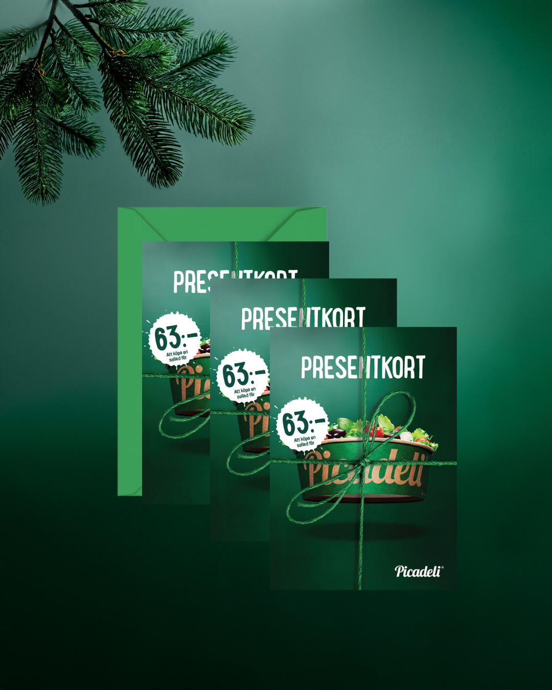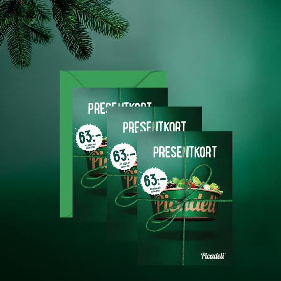 Ge bort en god smakupplevelse i jul i form av presentkort på en sallad. Eller rättare sagt tre presentkort à 63 kr/st. Eh... 63 kr?! Jo, det är vad en Picadeli-snittsallad kostar, beräknat på snittportion 450 g och ett konsumentpris på 139 kr/kg.